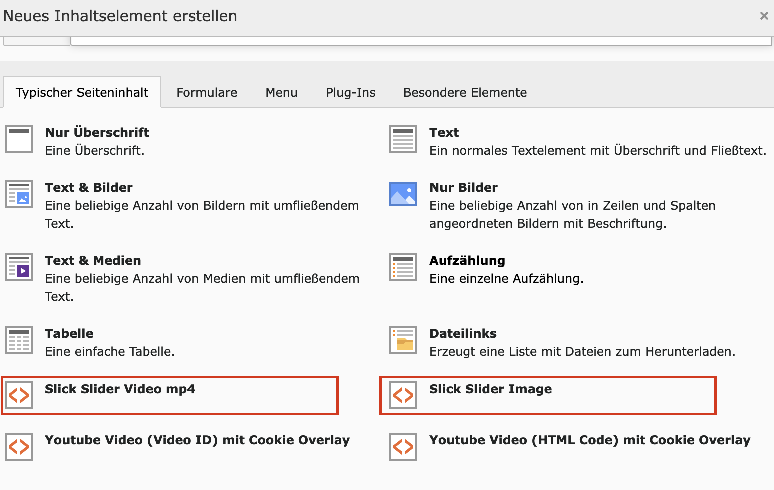 Ein neues Inhaltselement im Slider Bereich ein neues Inhaltselement vom Typ "Slick Slider Video mp4" erstellen.