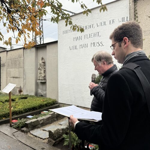 Ohne Geschichtelehrer Harald Rechberger vom BRG Hamerlingsstraße, der die Jugendlichen begleitete, hätte es das Projekt nicht gegeben. Die Möglichkeit zur Zusammenarbeit mit dem St. Barbara Friedhof sei eine „Mega Gelegenheit“, dass sich Schüler:innen an einem so bedeutungsvollen Ort wie einem Friedhof aktiv mit Geschichte auseinandersetzen und Erinnerungsorte gestalten. Besonders stolz ist er, dass sich die Schüler:innen intensiv auf die Auseinandersetzung mit den Themen eingelassen haben und sich selbst die Opfergruppen ausgewählt haben.