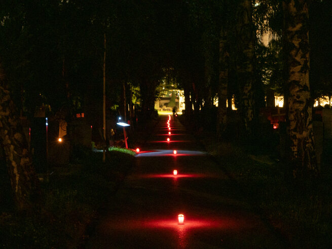 Das Licht Hunderter Kerzen auf den Wegen führt Sie zwischen 20 Uhr und Mitternacht zu unterschiedlichen Orten auf dem dunklen St. Barbara Friedhof.