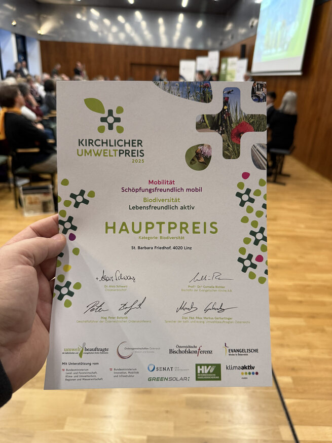„Mit seinem alten Baumbestand, dessen Wurzeln buchstäblich bis an die Anfänge des St. Barbara Friedhofs reichen, beruft sich der Trend zum Naturnahen auf eine gewisse Tradition.Wir freuen uns sehr, dass der kirchlich-ökumenische Umweltpreis würdigt, dass wir Verantwortung für künftige Generationen übernehmen und uns intensiv engagieren, die Naturoase mitten in der Stadt zu erhalten und ‚klimafit‘ zu machen“, sagt Friedhofsverwalter Clemens Frauscher.
